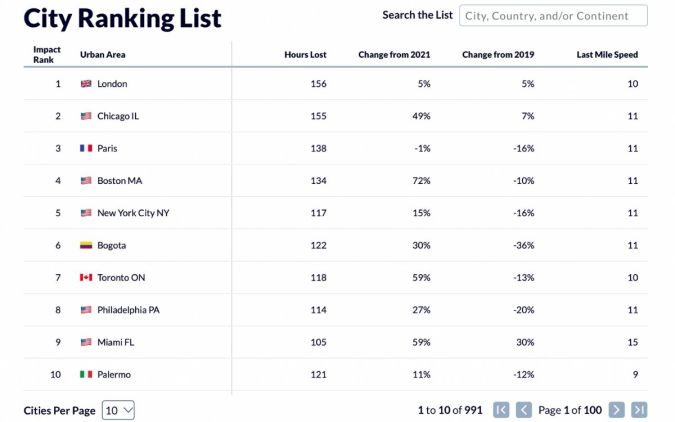 Estados Unidos también tiene ocho de las 25 peores ciudades del mundo para el tráfico y 19 de las peores 25 en América del Norte y 5 de 10 en el mundo con el peor tráfico.