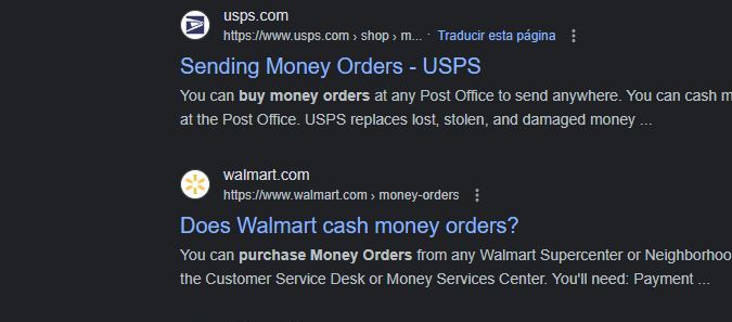 Aquí, a diferencia de Google Maps, te desplegará millones de resultados, poniendo en los primeros sitios los portales más confiables para comprar un money order, como puede ser el sitio web del Servicio Postal de los Estados Unidos (USPS), entre otros.