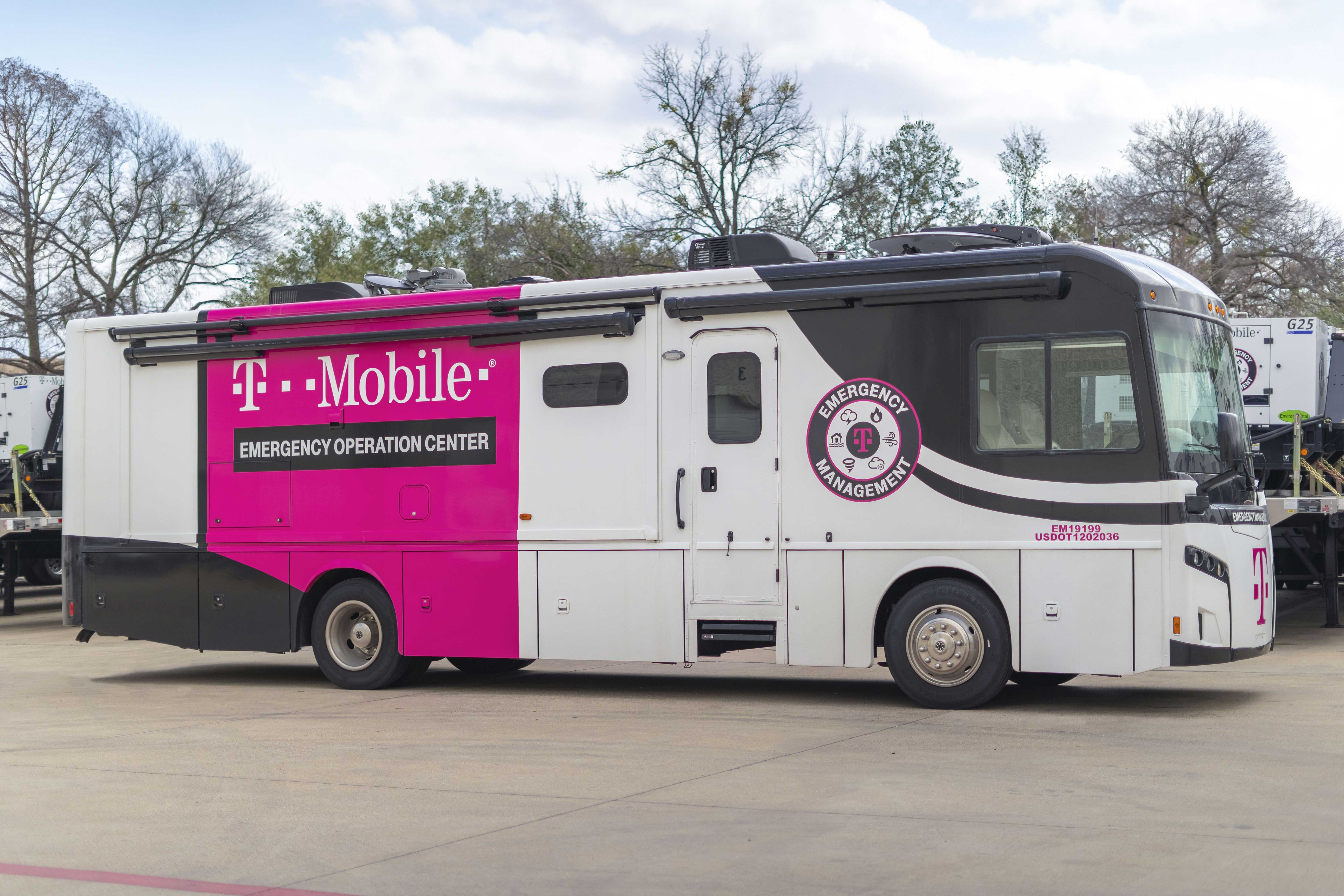 T-Mobile está aumentando su inventario de vehículos de red de uso intensivo para respuesta ante desastres —sitios celulares satelitales móviles (Cell-On-Wheels, o SatCOW) y sistemas celulares satelitales montados en camiones livianos (Satellite Cell-On-Light-Trucks, o SatCOLT)— en más de un 50%. Y este año, El Un-carrier también está agregando nuevos centros de comando móvil Clase Super C para operaciones de red in situ, así como nuevos camiones de uso intensivo para asistencia comunitaria que ofrecen carga de dispositivos, suministros para carga y wifi para el que lo necesite.