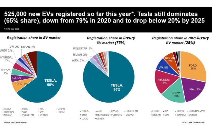 Según el más reciente reporte de S&P Global Mobility, Tesla acaparó 65% de las ventas en Estados Unidos, donde se vendieron 525,000 vehículos eléctricos – casi 340,000 de Tesla -, durante los primeros 9 meses de 2022.
