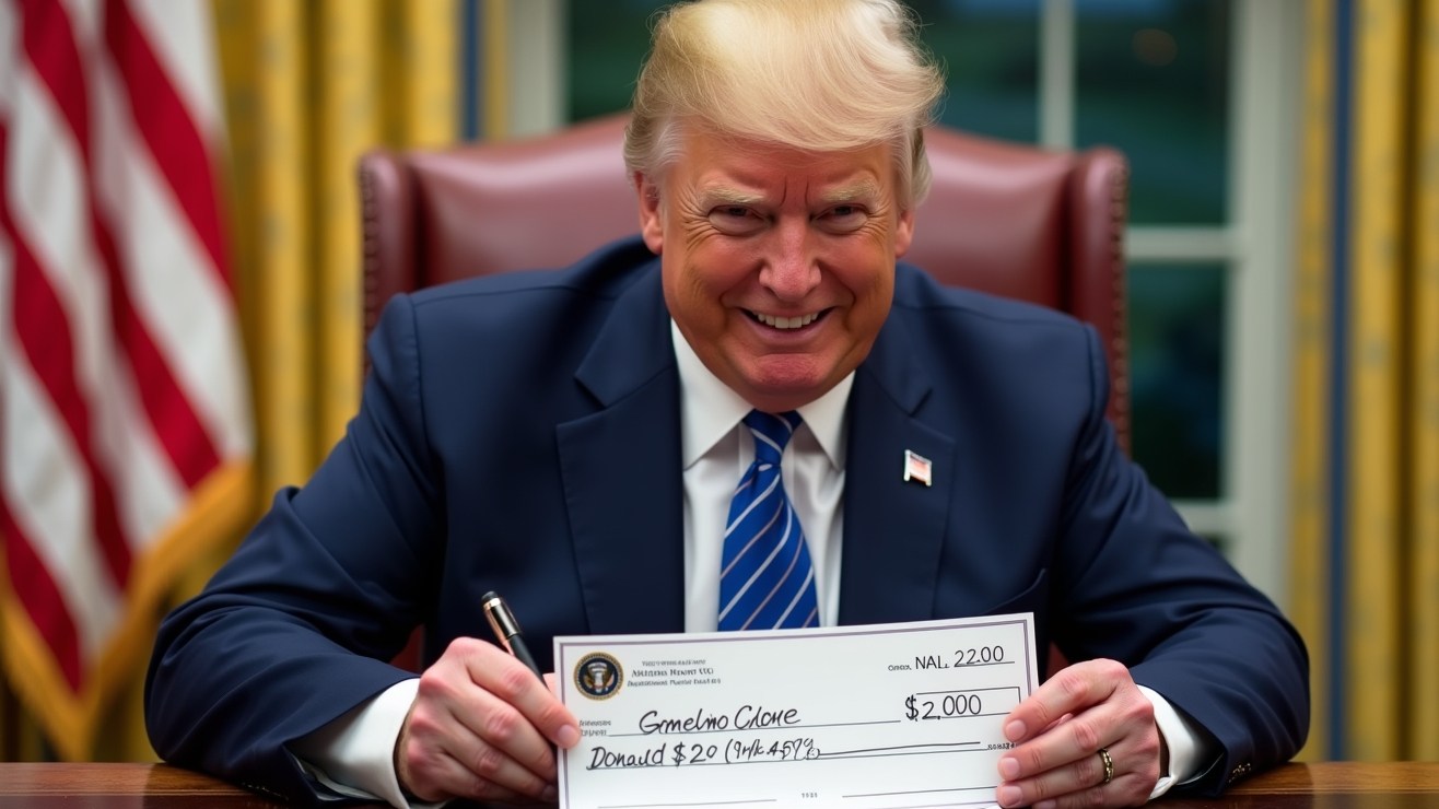 Donald Trump propone cheques de estímulo de hasta $2,000 dólares por imposición de aranceles. Imagen creada con Inteligencia Artificial). Crédito: leonardo.ai | Cortesía