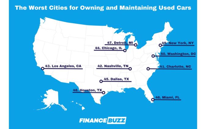 Para elaborar la clasificación por ciudades, FinanceBuzz identificó métricas que serían importantes para los propietarios de automóviles usados, así como para aquellos que buscan comprar un auto usado, como el costo, el mantenimiento y los factores ambientales que pueden afectar su vida útil. Luego recopiló los datos sobre cada métrica para 50 de las áreas metropolitanas más grandes de Estados Unidos.
